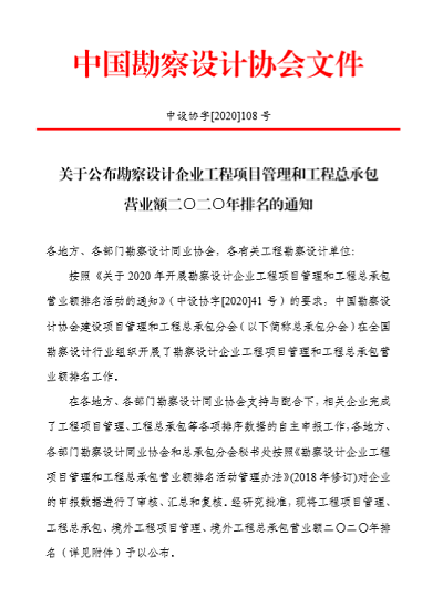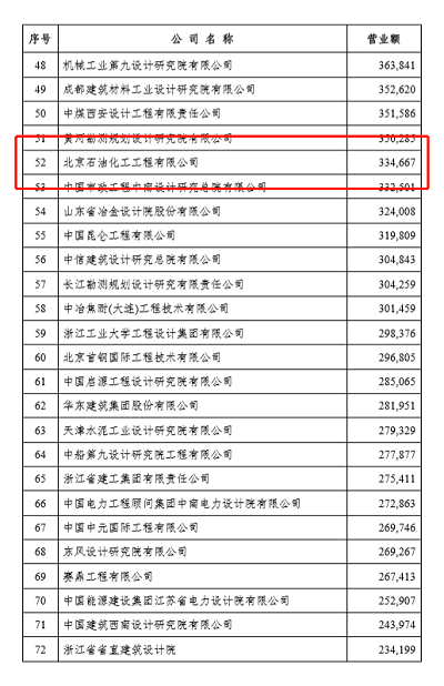 近日,中國勘察設計協會發布了《關于公布勘察設計企業工程項目管理和工程總承包營業額二0二0年排名的通知》,北京石油化工工程有限公司獲工程總承包營業額排名第52位、工程項目管理排名第88位。