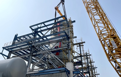 乙酸甲酯加氫反應器總重460噸,最大直徑5.9米,設備于臨近項目的制造廠完成整體制造后,采用模塊車運輸至現場。設備吊裝主吊采用1250噸履帶吊,400噸履帶吊溜尾。設備于10時38分起吊,歷時三小時順利就位于框架基礎上。