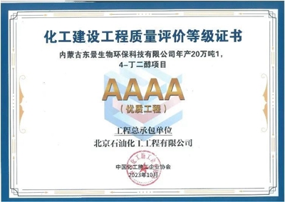 近日,中國化工施工企業協會公布2023年化工建設工程質量評價結果,北京石油化工工程有限公司總承包的“內蒙古東景生物環保科技有限公司年產20萬噸1,4丁二醇(BDO)項目”榮獲化工建設工程質量評價4A級(優質工程)。